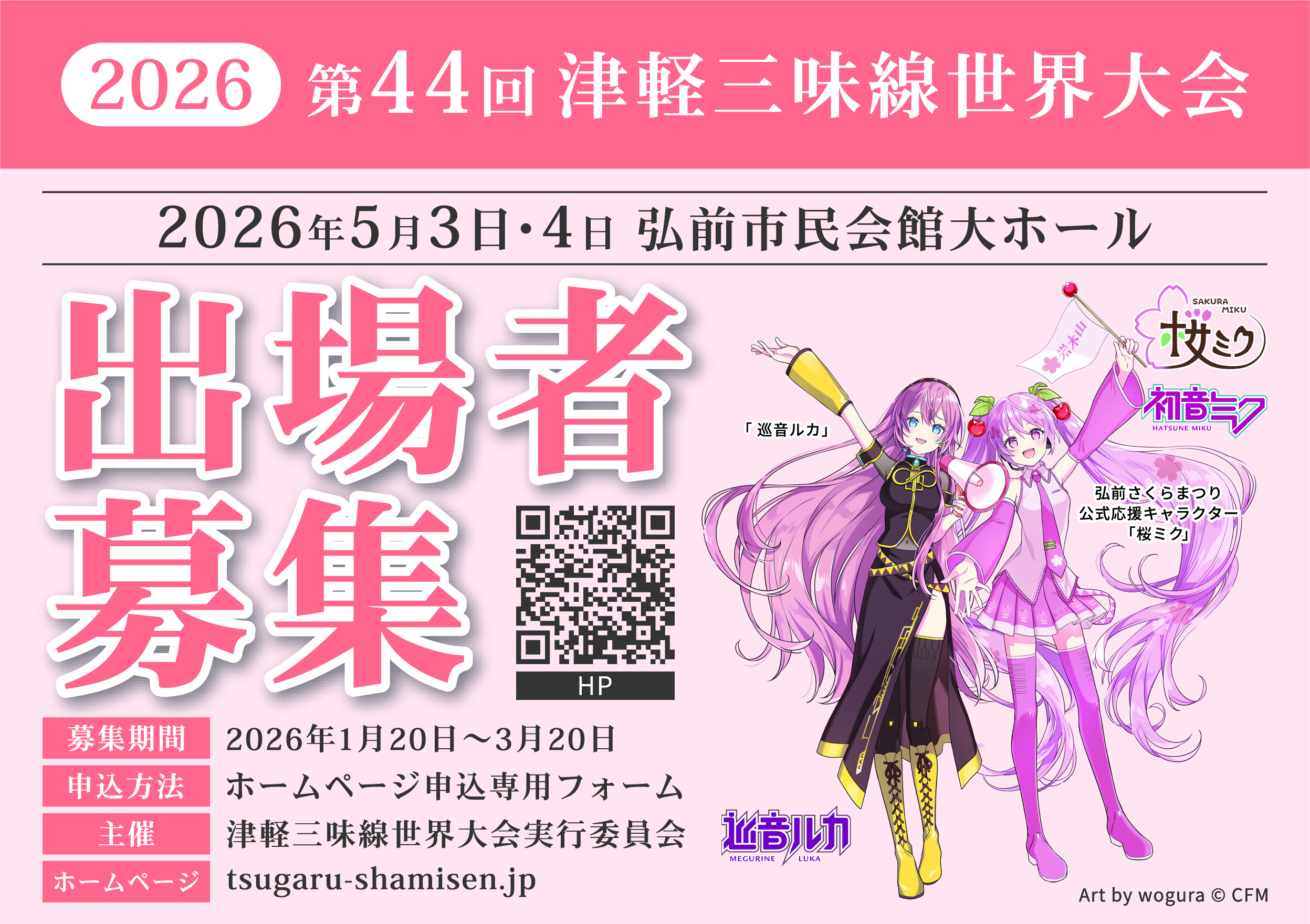 更新 2026.01.09 2026 第44回 津軽三味線世界大会の出場者募集は1月20日(金)から申込専用フォームにて受付を開始いたします。 大会の詳細については詳しくは2026第44回津軽三味線世界大会概要を参照ください。 投稿ナビゲーション 前へ2025 第43回津軽三味線世界大会終了いたしました X facebook